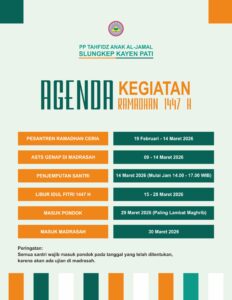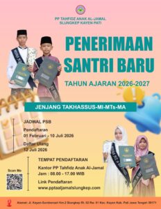 PP Tahfidz Anak Al-Jamal Slungkep Kayen Pati untuk anak tingkat Mts/Takhassus, yaitu minimal usia 13 tahun, untuk pendaftaran bisa di klik link diabwah ini: